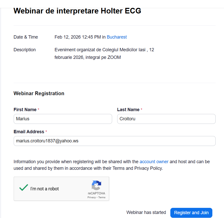 2. Veți fi direcționat către o pagină de internet a Zoom, unde trebuie să vă introduceți numele, prenumele și adresa de email, după care bifați optiunea I’m not a robot si apăsați pe butonul de Register and join